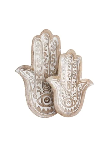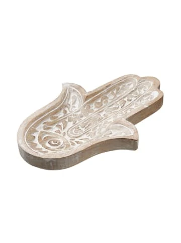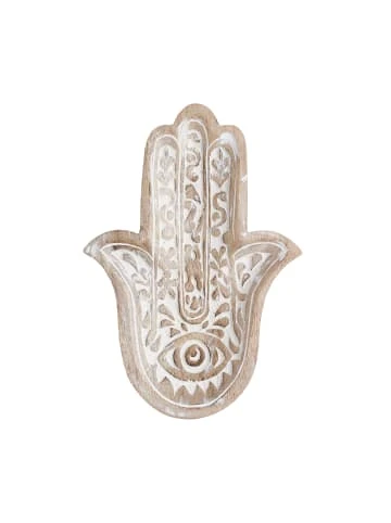 Schutz, Kraft, Glück: Bei der Fatima Dekoration aus naturfarbenem Mangoholz liegt die symbolische Bedeutung auf der Hand. Als Deko-Objekt ist die Hand kunstvoll mit Ornamenten verziert und mit weißer Farbe akzentuiert. So wird sie zu einem sommerlichen Hingucker, der insbesondere mit den Boho-, Asia- und Oriental-Stil harmoniert. In einer weiteren Größe erhältlich, ideal auch zum Kombinieren.