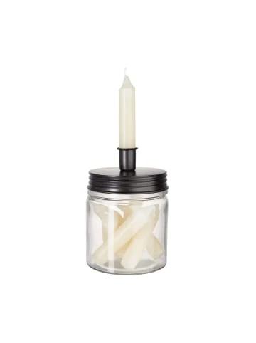 Raffiniert: Das Candle Jar Glas mit Kerzenhalter setzt dem Aufbewahrungsglas für Little Light Kerzen noch einen drauf: Auf dem Deckel aus schwarzfarbenem Metall kann eine der sieben cremefarbenen Little Light Kerzen befestigt werden. Sobald sie abgebrannt ist, ist Nachschub ohne langes Suchen griffbereit. Ganz schön praktisch dieses 2-teilige Set – und dekorativ sowieso.