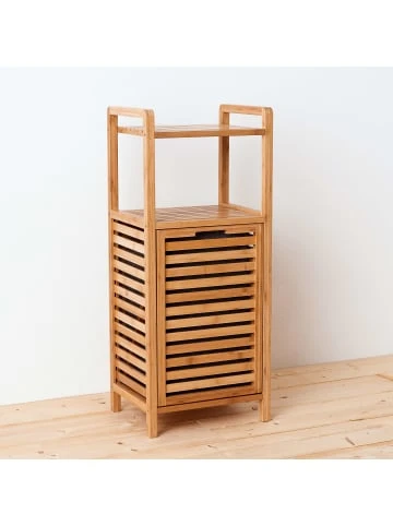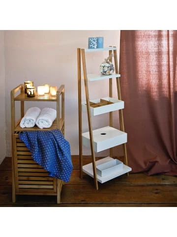 Alles aufgeräumt und griffbereit – mit diesem Regal mit herausnehmbaren Wäschekorb für Bad oder Schlafzimmer schaffen Sie für sich und für Ihre Siebensachen einen Platz zum Wohlfühlen. Zwei zusätzliche Ablageflächen bieten extra Stauraum für Badaccessoires wie Pflegeprodukte, Handtücher & Co. Bei der Big Bamboo-Möbelserie kommt das Naturmaterial Bambus ganz groß raus – harmonisch im Look und eher unempfindlich gegenüber Feuchtigkeit. – Im Bad alles griffbereit mit diesem Regal – Harmonischer Look feuchtigkeitsunempfindlich – Bambus, MDF, natur weiß – 40 x 31 x 95 cm Wäschekorb: 30 x 26 x 41 cm – Der Artikel wird zerlegt mit Anleitung geliefert.