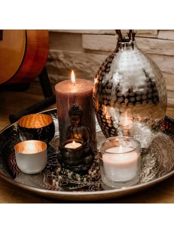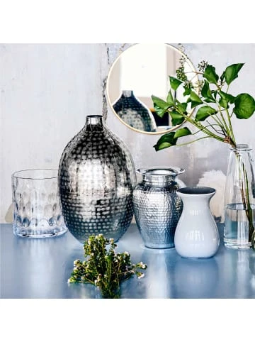 Im Orient genießt das Kunsthandwerk eine lange Tradition. Neben Pfannen und Töpfen werden auch Vasen und andere metallene Gefäße vorsichtig mit Hammer und Stichel bearbeitet, bis die Oberfläche eine leichte Struktur und damit ein charakteristisches Muster aufweist. Auch die silberfarbene Indira-Vase in klassischer Form besticht durch diesen besonderen Look. In einer weiteren Größe erhältlich. – Einfarbig – Struktur – Klassisch – Nicht f?r Sp?lmaschine geeignet!