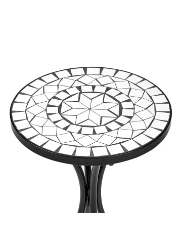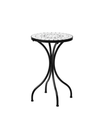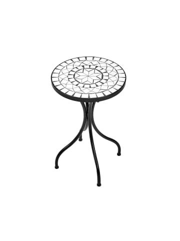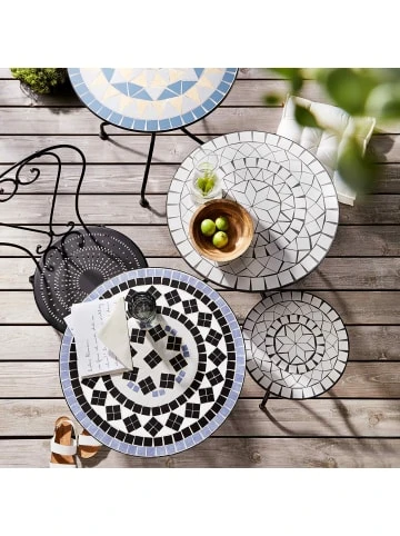 Moment mal: Der romantische Palazzo Beistelltisch aus schwarzem Eisen mit weißem Mosaik (Handarbeit) lädt im Wintergarten, auf der Terrasse oder dem Freisitz zum Cappuccino am Vormittag oder zum Espresso nach dem Essen ein. So viel Zeit muss sein. Weitere Varianten der Serie erhältlich. – Mosaik – Gemustert – Mediterran