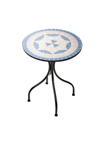 Moment mal: Der romantische Palazzo Tisch aus schwarzem Eisen mit creme-blauem Mosaik (Handarbeit) lädt im Wintergarten, auf der Terrasse oder dem Freisitz zum Cappuccino am Vormittag oder zum Espresso nach dem Essen ein. So viel Zeit muss sein. Weitere Varianten der Serie erhältlich. – Massive Tischplatte mit Mosaik: traditioneller Look – Wetterfeste Ausführung – Typischer Bistrotisch: genau richtig für 2 Personen