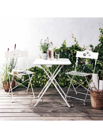 Sobald der Daisy Jane Klappstuhl aus Eisen im Freien steht, zwitschern die Vögel, tanzen die Sonnenstrahlen und das Gute-Laune-Barometer steht auf „besser geht´s nicht“. Denn die Daisy Jane Gartenmöbel-Serie versprüht Leichtigkeit pur- erhältlich in verschiedenen Farben. – Diese Gartenmöbel-Serie versprüht Leichtigkeit pur – Mit Blumen-Ausstanzung und Sitzfläche aus Latten – Alles jung im Look, platzsparend und vielseitig – Eisen pulverbeschichtet weiß – Breite 45 x Tiefe 41 x Höhe 87 cm Sitzhöhe 47 cm