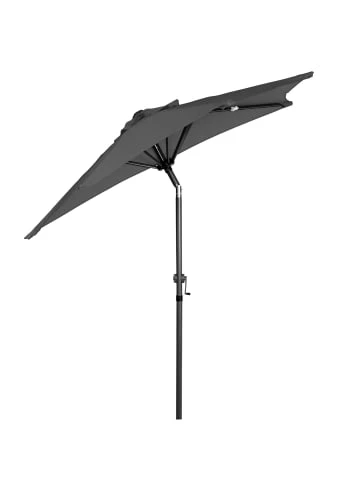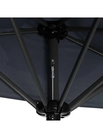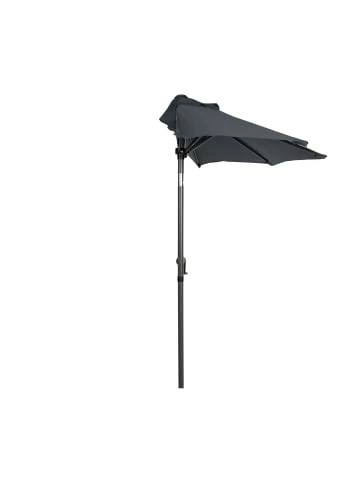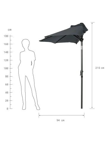 Sie spannen den halbrunden Siesta Sonnenschirm mit Polyesterbezug (UV-Standard 801) auf, sobald die Sonne hoch am Himmel steht. Einfach bei Bedarf kippen – und schon gönnen Sie sich eine kleine, erholsame Siesta im Schatten. – Spannen Sie den Siesta Sonnenschirm auf – Lieferumfang: 1x Siesta Sonnenschirm – Für den Außengebrauch geeignet. – Gestell aus Aluminium, Bezug aus Polyester – Breite 184 x Tiefe 94 x Höhe 215 cm, Höhe der Kippfunktion: 163 cm, Schirmstange: Ø 38 mm, Höhe der Kurbel 115 cm, Tiefe der Kurbel 12 cm