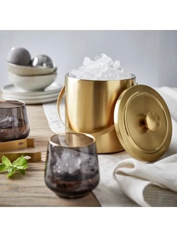 Der hochwertige goldene On Ice Eiseimer mit Zange sorgt auf Partys, beim Cocktail-Mixen, beim Essen und vor allem auch in der warmen Jahreszeit für erfrischenden Nachschub. Der Trick dabei: In dem Gefäß aus doppelwandigem Edelstahl bleibt die Temperatur schön kühl, so dass die Eiswürfel nicht so schnell dahinschmelzen. Und das heißt für Sie als Gastgeber: Einmal auffüllen, und schon müssen Sie sich nicht mehr ständig kümmern.