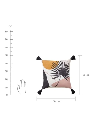 Das bunte Parea Kissen Palmenblatt im modernen Ethno-Stil ist ein trendiger Hingucker auf Ihrem Sofa, Sessel oder Bett. Die Troddeln an den Ecken geben dem Kissen eine wohnliche Note und unterstreichen seinen authentischen Look. Dazu einfach ein paar Vasen, Windlichter und Bilder im Ethno-Stil kombinieren, fertig ist das kleine Makeover Ihres Zuhauses. Bezug aus reiner Baumwolle, Füllung aus Polyester. Weitere Parea Kissen erhältlich, ideal auch zum Kombinieren.