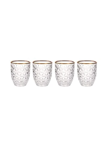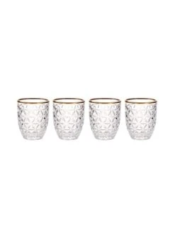 Ob zum Kaffee oder zum Wein: Ein Glas frisches Wasser in einem Aurelie Glas im 4er-Set ist immer ein gern gesehener Begleiter. Es löscht den ersten Durst und neutralisiert den Geschmackssinn, so dass man sich besser auf die feinen Aromen eines guten Espressos oder edlen Tropfen konzentrieren kann. Glas mit goldenem Rand und in Kristalloptik. – Einfarbig – Festesssen – Modern – Nicht f?r Mikrowelle geeignet! – Nicht f?r Sp?lmaschine geeignet!
