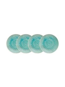 Die kleinen, Sumatra Teller in Türkis mit einem Durchmesser von 21 cm und traditionellem Dekor sind ein wundervoll handbemaltes Geschirr-Set mit effektvoll glänzender Glasur und bestens als Teller für Salate oder Desserts geeignet. Die bunten Teller aus Steinzeug im 4er-Set sind ein echter Blickfang auf Ihrem gedeckten Tisch. Die kostbare Optik der bunten Teller bietet einen feinen Kontrast zu den sehr scharf gewürzten Speisen, die man traditionell auf der Insel Sumatra reicht. – Handbemalte und robuste Keramik in zarter Optik – Kontrast: Glänzende Innenglasur und matte Außenglasur – Fühlbare Reliefstruktur in leuchtenden, harmonischen Farben – Krakelee-Effekt: gesprungene Glasur nach asiatischem Vorbild – Hervorragend kombinierbar für Hochzeit, Festessen, Sommerparty
