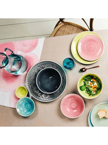 Jedes Teil des 12-teiligen Geschirrsets aus Steinzeug, bestehend aus Speisetellern, kleinen Tellern und Suppenschalen, ist handbemalt, die effektvoll glänzende Glasur in exotischen Farben (innen eher matt) unterstreicht die kostbare Optik. Was für ein sanfter Kontrast zu den sehr scharf gewürzten Speisen, die man in Padang und ganz Sumatra traditionell reicht. – Handbemalte und robuste Keramik in zarter Optik – Kontrast: Glänzende Innenglasur und matte Außenglasur – Fühlbare Reliefstruktur in leuchtenden, harmonischen Farben – Krakelee-Effekt: gesprungene Glasur nach asiatischem Vorbild – Hervorragend kombinierbar für Hochzeit, Festessen, Sommerparty