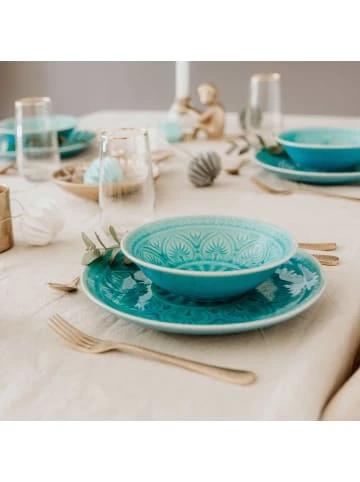 Jedes Teil des 12-teiligen Geschirrsets aus Steinzeug, bestehend aus Speisetellern, kleinen Tellern und Suppenschalen, ist handbemalt, die effektvoll glänzende Glasur in exotischen Farben (innen eher matt) unterstreicht die kostbare Optik. Was für ein sanfter Kontrast zu den sehr scharf gewürzten Speisen, die man in Padang und ganz Sumatra traditionell reicht. – Handbemalte und robuste Keramik in zarter Optik – Kontrast: Glänzende Innenglasur und matte Außenglasur – Fühlbare Reliefstruktur in leuchtenden, harmonischen Farben – Krakelee-Effekt: gesprungene Glasur nach asiatischem Vorbild – Hervorragend kombinierbar für Hochzeit, Festessen, Sommerparty