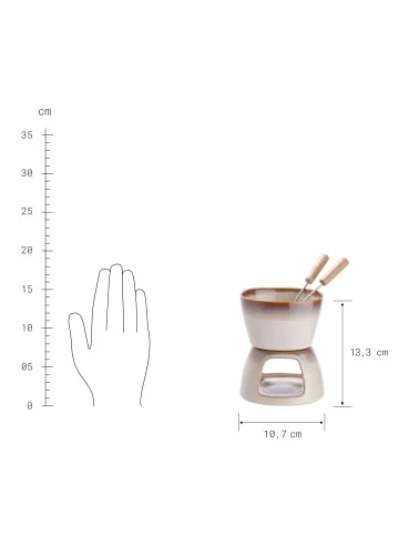 Ob allein oder zu zweit: Sie versüßen sich den Moment mit dem spülmaschinengeeigneten Au Chocolat Mini Fondue aus Steinzeug. Die rundliche Form und die reaktive Glasur in Beige verleihen dem Fondue einen natürlichen Retro-Look, und natürlich sind auch zwei Gabeln aus Edelstahl und Bambus (nicht spülmaschinengeeignet) im Set enthalten. Da bekommen Sie gleich Appetit, zum Dessert Kekse und Obststückchen in flüssige Schokolade einzutauchen.