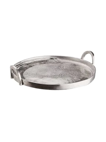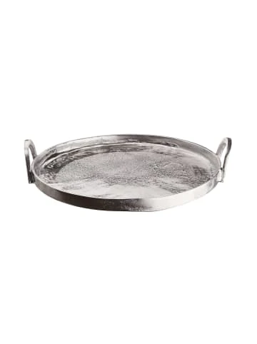 Mit dem runden Banquet Deko Tablett mit Griffen aus Aluminium in Silber schaffen Sie die elegante Grundlage für Ihre individuelle Deko: Einfach Kerzen, Windlichter, Vasen und andere ausgesuchte Objekte auf dem Tablett anordnen und dann auf einem Beistelltisch oder auf dem Esstisch platzieren. Auf der festlich gedeckten Tafel macht sich das Dekotablett mit 40 cm Durchmesser auch gut als Untersetzer für Flaschen und Karaffen. Mit Filzpunkten an der Unterseite zum Schutz empfindlicher Möbel.