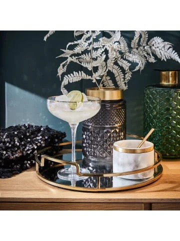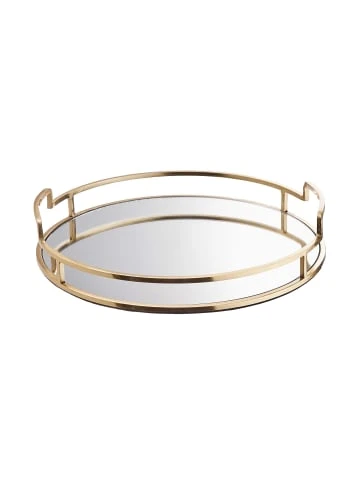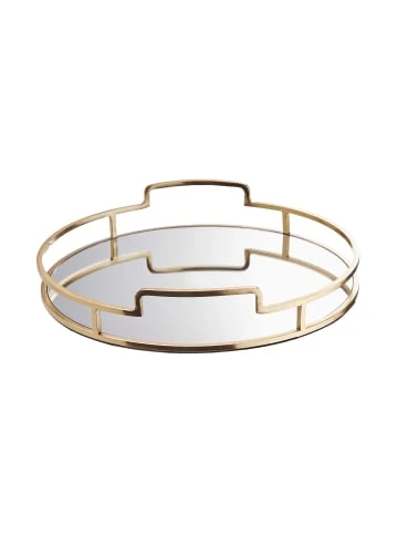 Dekorativ, dekorativer, Art Deco Tablett mit Spiegelplatte! Dieses edle Tablett aus goldfarbenem Metall und Spiegel-Glas wertet Ihre Einrichtung ganz schick auf. Auf dem Esstisch, einer Kommode oder einem Bestelltisch platziert, zieht das Deko-Tablett im Stil der 1920er Jahre als Highlight alle Blicke auf sich. Tipp: Entweder als einzelnes Objekt dekorieren oder mit einer eleganten Glasvase oder einem geschliffenen Glasflakon arrangieren.