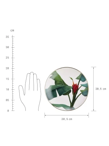 Mit Ihrem Fernweh bekommen Sie Appetit auf alles, was nach Sonne, Süden und „ganz weit weg“ schmeckt. Da dürften auch die Tropical Teller mit edlem Goldrand ganz nach Ihrem Geschmack sein. Die dekorativen Teller aus New Bone bringen einen Hauch Exotik und ein bisschen Urlaubsstimmung auf den gedeckten Tisch. Und das harmoniert hervorragend mit frischen Südfrüchten und der Küche ferner Länder. Mit Ananas- und Bananenblatt-Motiv (Druck) erhältlich, ideal auch zum Kombinieren.