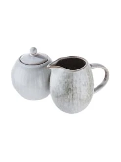 Die Henley Zuckerdose und Milchkännchen aus Steinzeug freut sich schon darauf, mit Ihnen und Ihren Freunden beim Frühstück oder einem Kaffeekränzchen zu essen. Und genau wie Sie steht sie auf diese unkomplizierte, authentische Art, die sich beim Kochen, Tischdecken und Dekorieren lieber vom Gefühl als von strikten Vorgaben leiten lässt. Aus der Henley Serie sind passend erhältlich: ein großer Teller, ein kleiner Teller, eine Tasse, eine Teekanne und weitere Schalen, sowie Aufbewahrungsdosen. – Hochwertige Keramik: Robust und hitzebeständig – Jedes Teil ein Unikat: Natürliche Unterschiede bei der Farbgebung – Reaktive Glasur: Jedes Teil ein Unikat, durch Unterschiede bei der Farbgebung – Ein natürlicher Look mit Charme und Charakter – Im Trend: Skandinavisches Design – Geeignet für jeden Anlass durch schlichte und solide Machart